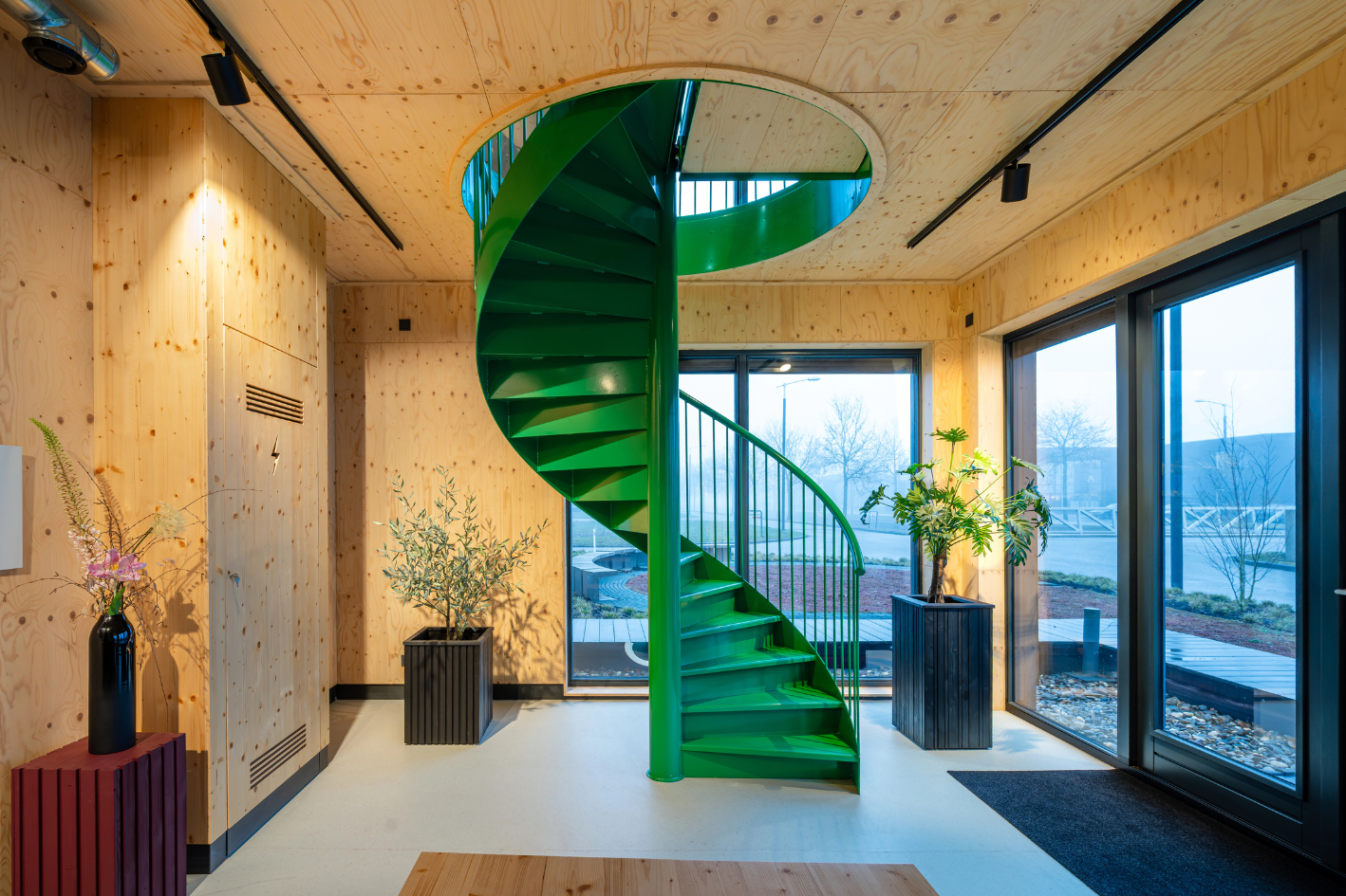 - Waar geen hergebruikte materialen voor handen waren is eerlijk massief vurenhout (CLT) ingezet en een minimum aan metaal toegepast, demontabel